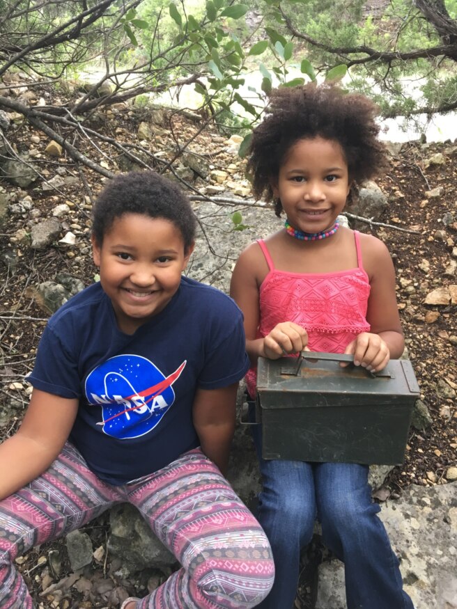 Von all den Fotos, die ich von Caches und Cachern gemacht habe, ist dasjenige, zu dem ich immer wieder zurückkehre, eines meiner Töchter, als sie noch klein waren und CenTex Prime (GCEF) in den Händen hielten, als sie 9 und 7 Jahre alt waren (volle Offensichtlichkeit: Ich bin ihnen gegenüber furchtbar voreingenommen, da sie meine Lieblingsmuggles waren und jetzt meine Lieblingscacher sind).